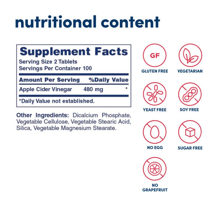 Apple Cider Vinegar tablets deliver all the nutritional benefits of apple cider vinegar, and are provided in tablet form for those who don’t enjoy the tart taste of vinegar. Popular with fitness enthusiasts and individuals following healthy diets, Apple Cider Vinegar can be added to your balanced diet and wellness program.