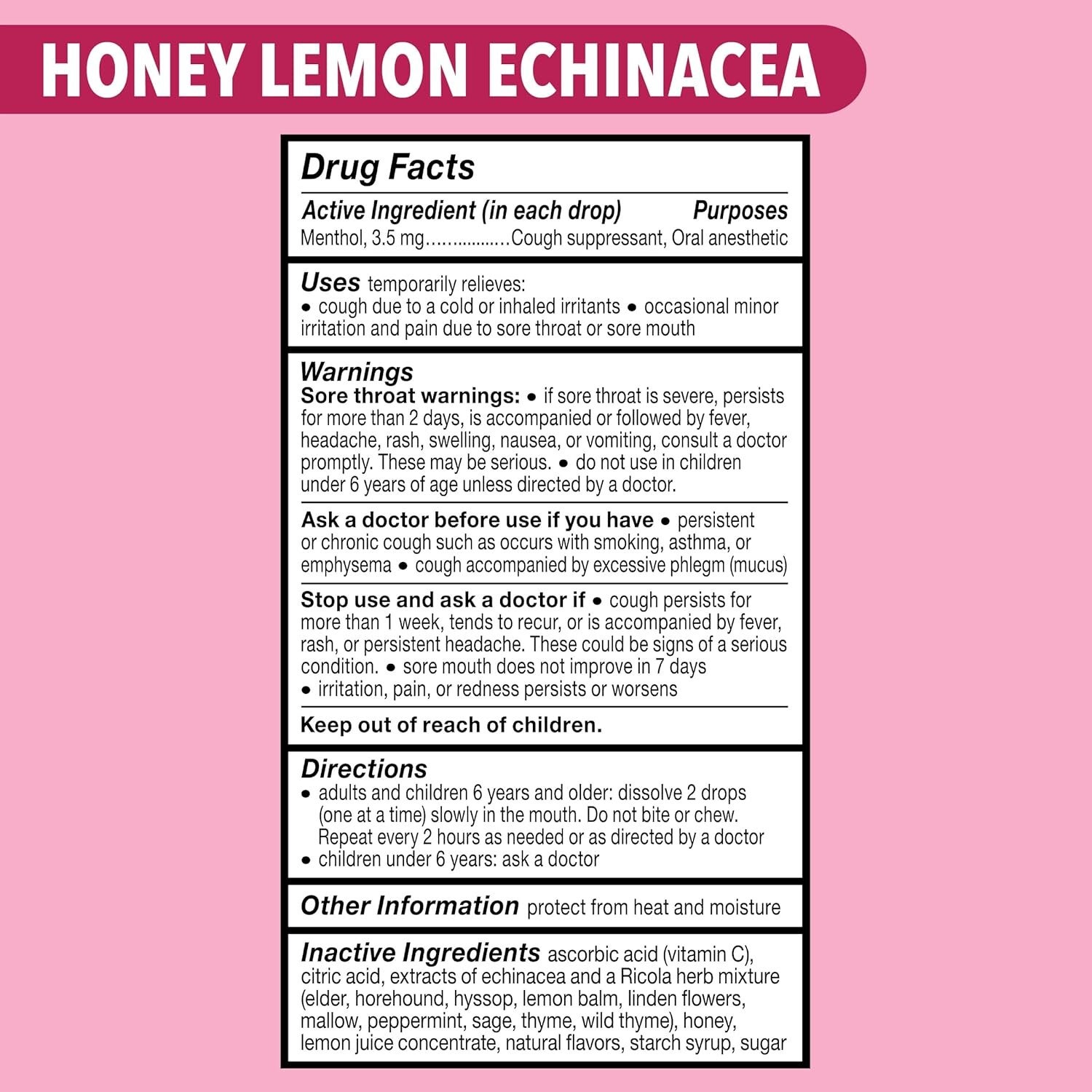 - Ricola Honey Lemon with Echinacea cough drops help soothe your cough and sore throat. The pleasing taste of these Ricola cough drops comes from golden honey with refreshing herbal lemon balm and Echinacea extract and Ricola's special herb blend. For nearly a century, Ricola has been helping throats around the world feel better.