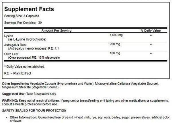 Three Capsules Contains: L-lysine 1500mg, Vitamin C (Ascorbic Acid) 100mg, Garlic (odorless) 200mg, Echinacea Extract (4:l PE) 100mg, Propolis 50mg, Licorice Extract (4:1 PE) 15mg, Goldenseal Root USP (Hydrastis) 15mg. Other ingredients: Vegetable stearine, cellulose, dicalcium phosphate, cellulose gum, vegetable stearate, PEG, silica, magnesium silicate, titanium dioxide and natural caramel color.