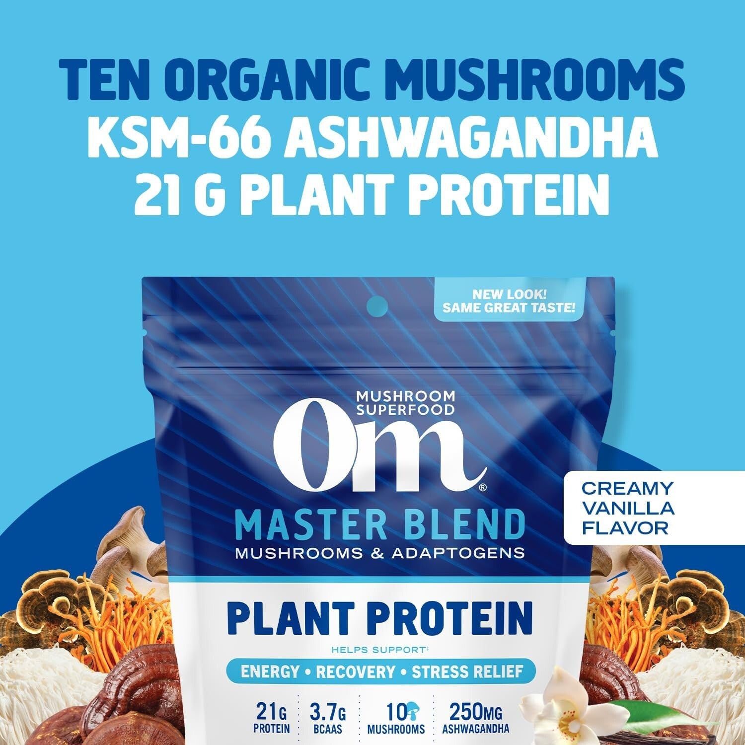 - Om Mushroom Superfood Master Blend Plant-Based Protein Powder: Contains one 18.27 ounce pouch (14 servings) of Creamy Vanilla Protein Powder with 10 Mushroom Species including Cordyceps, Reishi, Lions Mane, Turkey Tail, Chaga, and more for optimal health and recovery. Each serving of this organic mushroom complex provides 21 grams of plant-based protein and 2,000mg of mushrooms