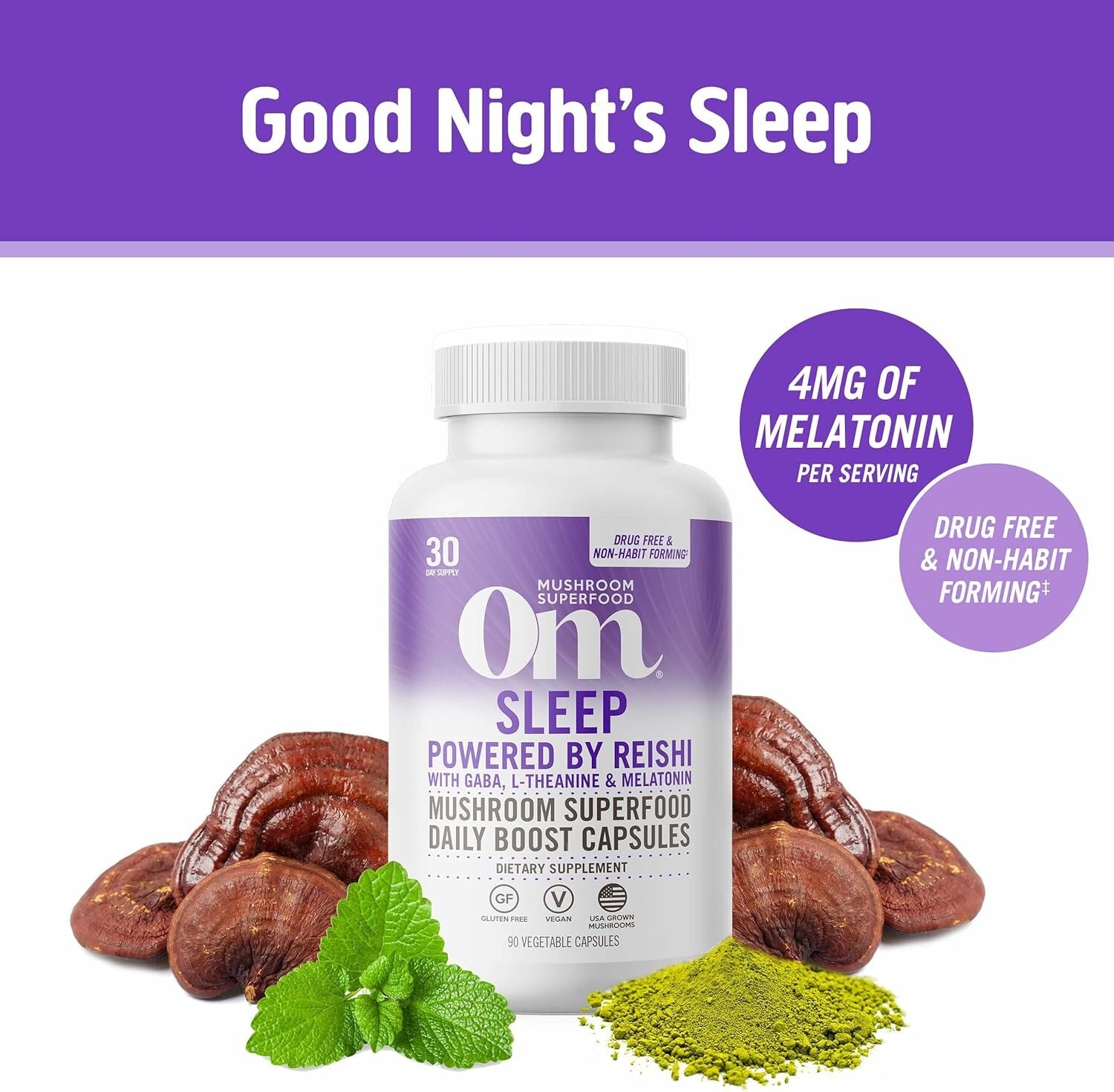 Om Mushroom Superfood Sleep Mushroom Capsules Superfood Supplement: Contains a 90 count, 30 day supply, Reishi, GABA, L-Theanine, Melatonin for Rest & Sleep, Quality Superfood Supplement