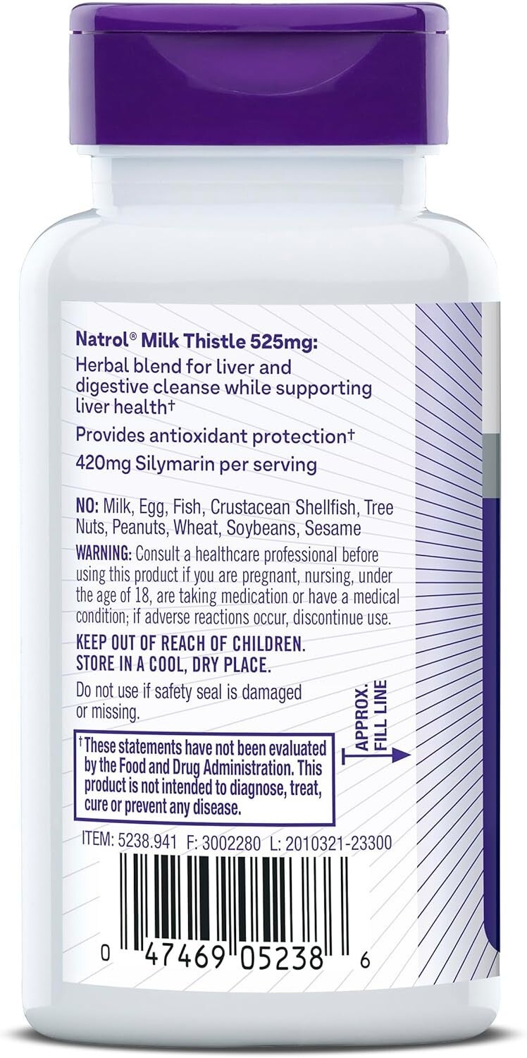 Natrol Milk Thistle capsules offer a dietary supplement option to help support liver health and provide antioxidant protection.(1) Also, Milk Thistle provides an herbal blend for liver and digestive cleanse.(1) This milk thistle supplement provides 525 mg of milk thistle extract, with 420 mg silymarin per serving. Made with high-quality ingredients, this dietary supplement is 100% drug free with no common food allergens. Adults, take two capsules, one time daily with a meal. Natrol is committed to creating innovative, quality products to support your health and well-being in your busy, modern lifestyle. (1)These statements have not been evaluated by the Food and Drug Administration. This product is not intended to diagnose, treat, cure or prevent any disease.