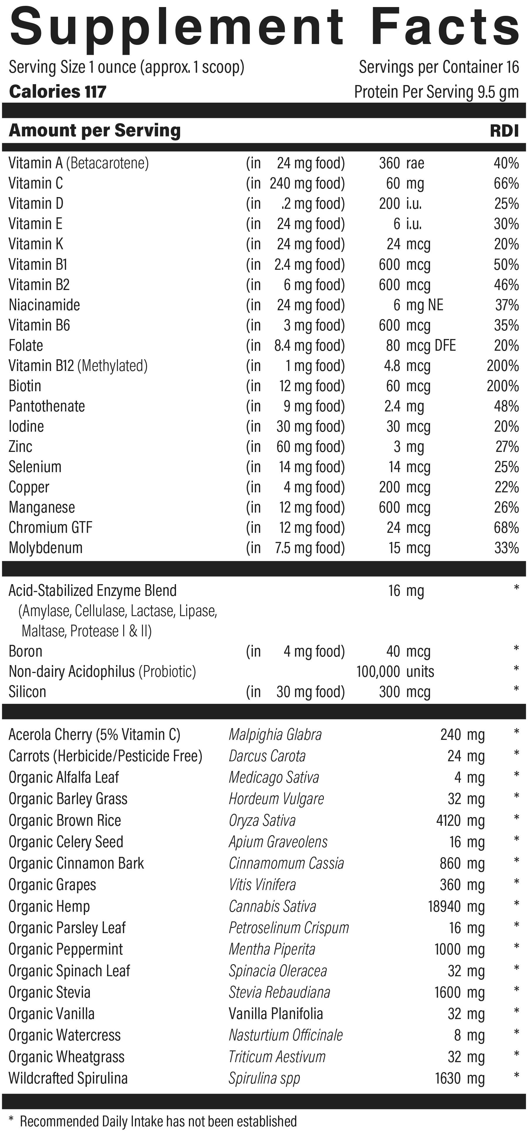 The foods in Vitamin-Mineral Shake™ naturally supply Calcium, Choline, Inositol, Magnesium, Phosphorus, and Potassium, as well as Carbohydrates, Lipids, Monosaccharides (including all considered essential), Proteins (including all ten essential amino acids), Superoxide Dismutase, and Trace Minerals as found in enzymatically processed Saccharomyces cerevisiae, Acerola Cherries, Whole Oranges, Carrots, Broccoli, Cabbage, and Rice—all vitamins and minerals shown above are contained in these foods.